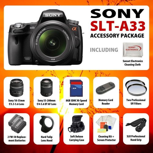 Sony Alpha DSLR-SLT-A33 Digital Camera W/ 18-55mm & 55-200MM Lenses With "Essentials" Accessory Package Kit Includes HD Professional UV Filter, 8GB High Speed Error Free Memory Card, Extended Life Replacement FW50 Battery Pack, Deluxe Carrying Case, Camera Hand Strap, Flower Lens Hood + More